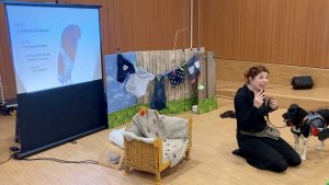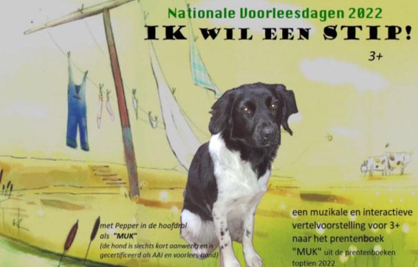 Een muzikale vertelvoorstelling met projectie en met échte hond naar het prentenboek “MUK” uit de prentenboeken toptien 2022. 30 minuten